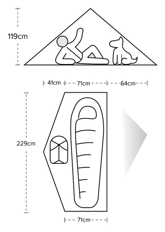 Enfin, son architecture asymétrique crée un volume déporté, au lieu d'avoir votre sac à dos qui réduit votre espace pour dormir, il a sa propre "niche" dédiée à l'intérieur de l'abri, bien au sec.