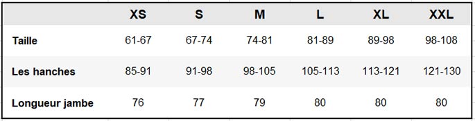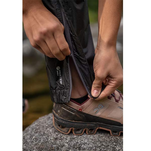 Sa taille est entièrement élastiqué et possède aussi un cordon de serrage. Des fermetures éclair de la cheville au mollet facilitent l'enfilage et le retrait chaussures aux pieds. Des crochets élastiqués permettent de fixer le bas du pantalon en "mode guêtre". Enfin une poche arrière zippée se double d'un sac de rangement et contient une boucle pour mousqueton et un crochet pour clés.