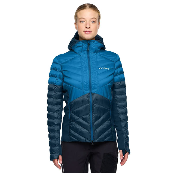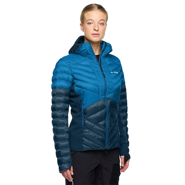 La Women's Sesvenna Pro Jacket II de Vaude est une doudoune femme chaude et isolante garnie de duvet synthétique chauffant recyclé et aux propriétés très analogues à celles du duvet naturel.